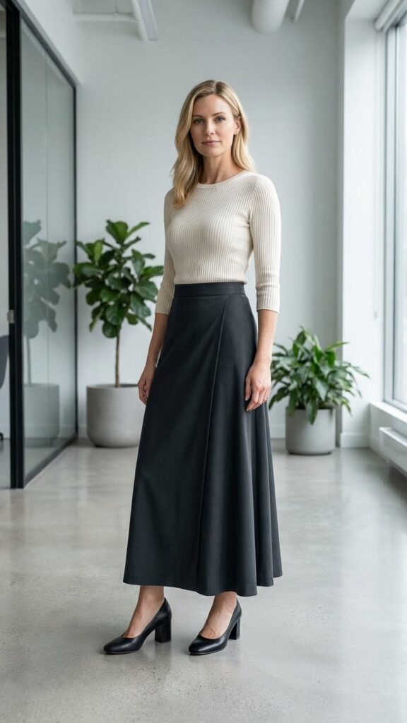 One timeless combination that never fails to make a professional impression is pairing a classic black maxi skirt with essential wardrobe staples. You’ll create an instantly polished look by tucking a crisp white button-down into your maxi and adding a structured blazer. This outfit works perfectly for client meetings, presentations, or daily office tasks.