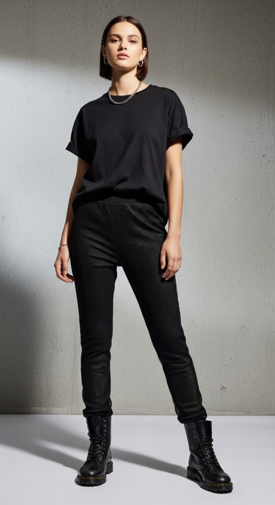 You know that friend who always looks effortlessly cool in head-to-toe black? Be that friend. Black mesh trousers over black leggings or fitted pants, paired with an oversized black tee or hoodie, and finished with combat boots creates this moody, street-style aesthetic that never fails. The mesh adds texture without breaking up the monochrome vibe, which keeps things interesting without trying too hard. Roll up the sleeves, add some silver jewelry, and boom—you’ve got instant edge. This look works for concerts, casual dates, or literally any day you want to feel like the main character.