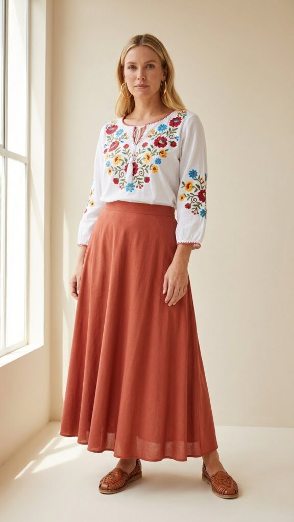 This combo is basically the golden standard for Mexican party outfits, and honestly? It never misses. A white or cream embroidered blouse, often called a “blusa bordada,” paired with a colorful maxi skirt creates that perfect balance of traditional and totally wearable.