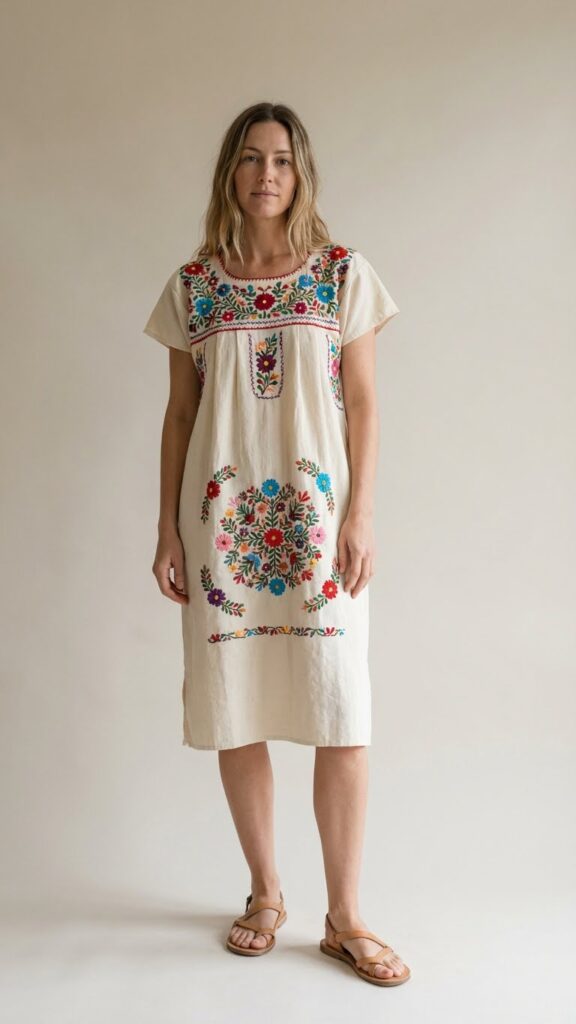 A huipil is a traditional Mexican tunic dress featuring stunning woven or embroidered designs. Modern versions maintain the beautiful craftsmanship while offering more tailored silhouettes.