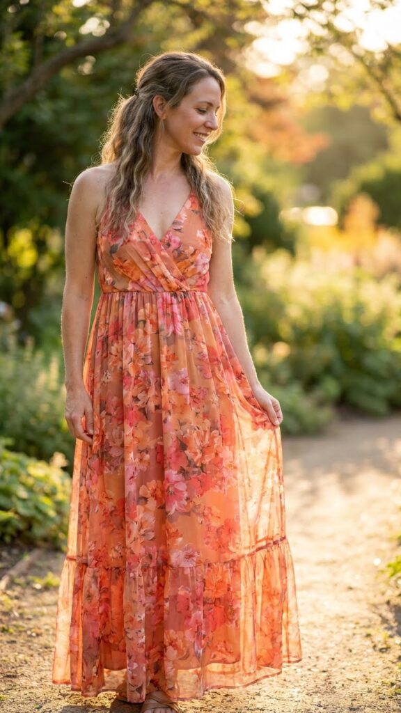 Sometimes simple is stunning. A floral maxi dress in warm sunset tones like orange, pink, coral, and gold captures the spirit of Mexican celebrations without requiring you to overthink anything.