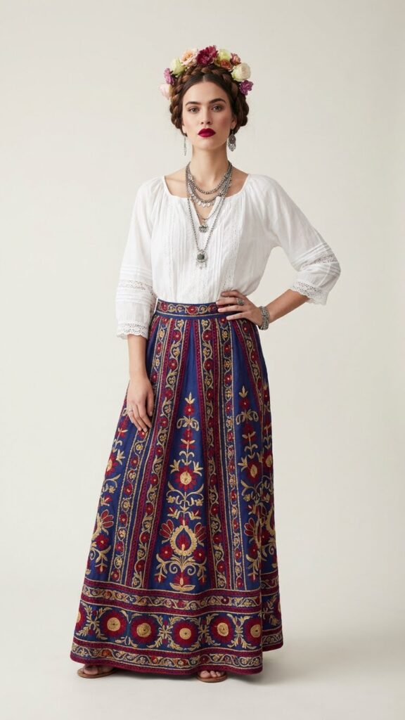 The embroidery does all the heavy lifting here. Look for pieces with floral patterns in bright pinks, oranges, and turquoise. The key is letting the blouse be the star while keeping your skirt in a complementary solid color or subtle pattern. I once made the mistake of pairing two heavily embroidered pieces together. Let’s just say I looked like a walking craft fair booth.