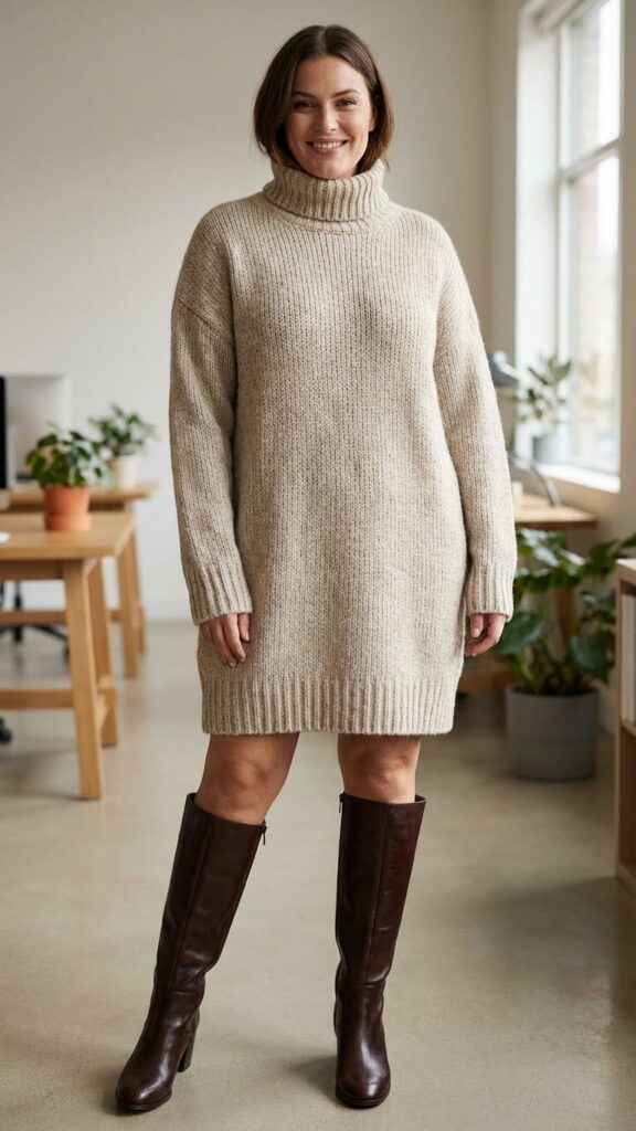 Choose a cozy oversized sweater dress that skims your curves without clinging too tightly. The loose fit provides comfort while maintaining a professional appearance. Pair it with sleek leather knee high boots to add structure and sophistication to your look.