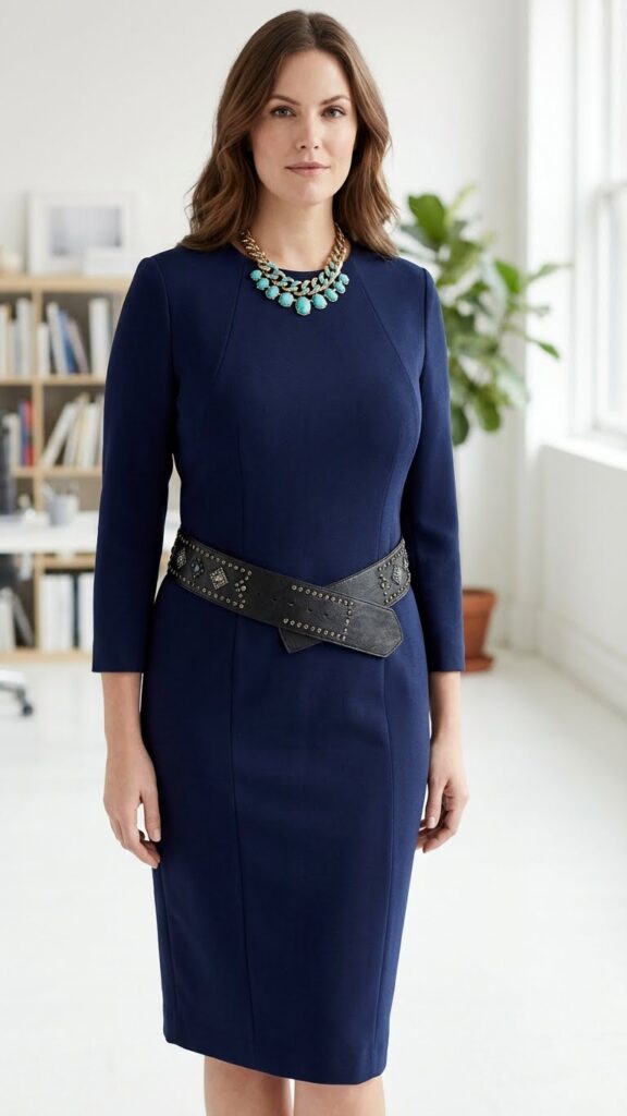Transform your basic sheath with bold neckline accents like chunky gold chains or colorful statement earrings that draw attention upward. Add statement belt emphasis by cinching your waist with a wide leather belt or chain-link design. These accessories define your silhouette beautifully while adding personality to your professional wardrobe without overwhelming your frame. This combination perfectly embodies corporate office attire standards while allowing your personal style to shine through in professional environments.