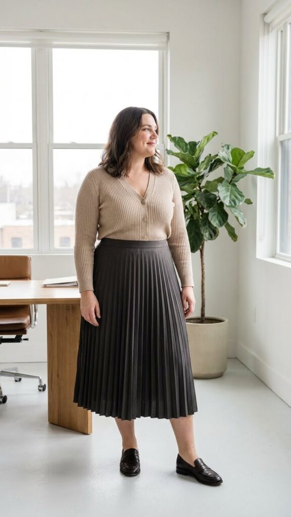 This pairing of enhanced basics works beautifully for midsize figures by defining your waistline and creating a sleek silhouette. Tuck your cardigan partially into the skirt’s waistband for added definition. The key to mastering cardigan-inspired office looks is focusing on the effortless layering technique that adds dimension without bulk.