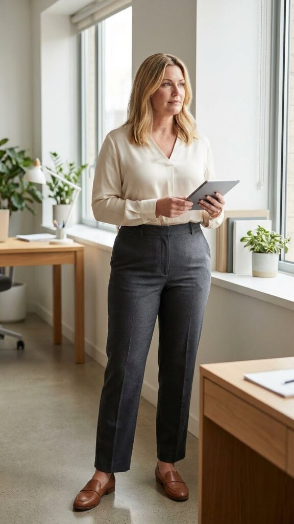 High-waisted trousers paired with a well-fitted button-down shirt create one of the most flattering and professional combinations for midsize women. This classic pairing defines your waist while elongating your legs, giving you complete control over your silhouette.