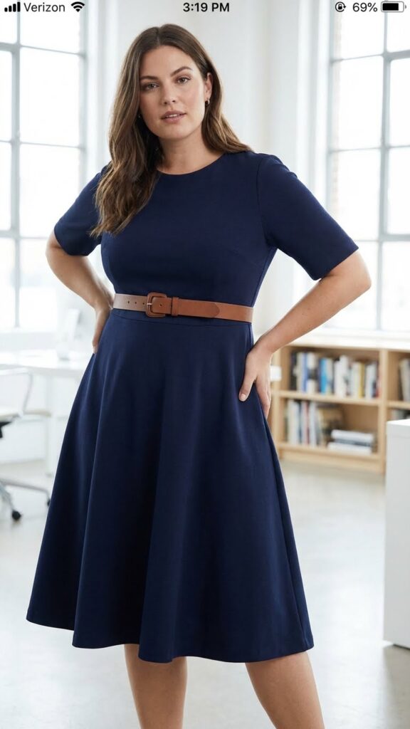 Because fit-and-flare dresses naturally accentuate your waist while skimming over your hips, they’re perfect for creating that coveted hourglass silhouette in professional settings. Adding a belt alters this classic style into workplace magic.