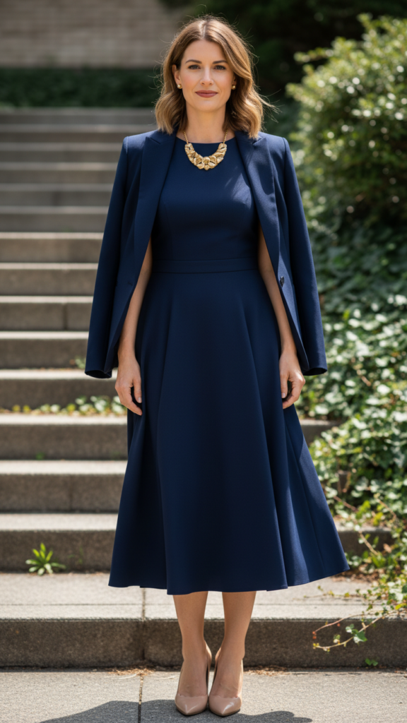 Elevate your look with strategic statement necklace pairing that draws attention to your neckline. Choose chunky gold chains, pearl strands, or colorful beaded pieces that complement navy’s versatility. Complete the ensemble with nude pumps and a structured blazer for cooler venues. This combination creates a polished appearance that honors your graduate’s achievement. For the most elegant convocation look, consider adding delicate earrings that won’t compete with your statement necklace while still adding a touch of sparkle.