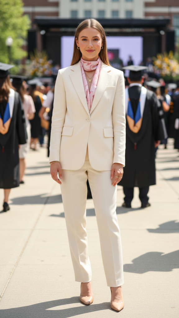 Sophistication meets versatility when you choose a cream-colored pants suit paired with a delicate pastel scarf for graduation day. This timeless ensemble offers the perfect balance between professional polish and maternal warmth that celebration calls for.