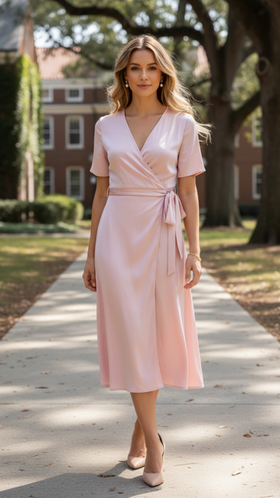 Blush pink wrap dresses create an effortlessly feminine silhouette that’s perfect for celebrating your graduate’s milestone moment. The wrap style flatters various body types while providing comfortable movement throughout the ceremony. You’ll love how this soft color photographs beautifully against graduation caps and gowns.