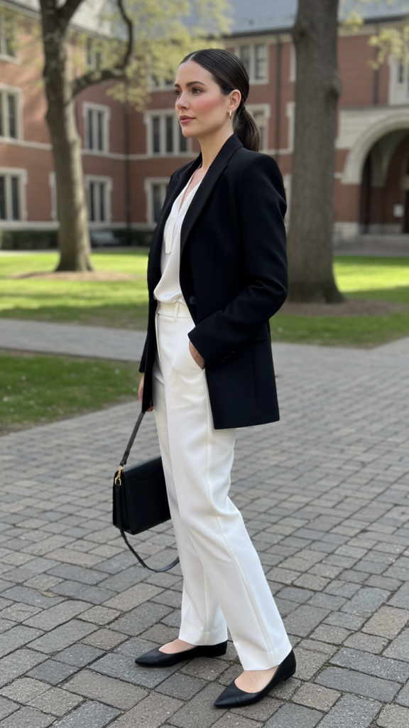 Timeless black blazers paired with crisp white trousers create a polished look that commands respect at any graduation ceremony. You’ll project confidence while maintaining the freedom to move comfortably throughout the celebration. Choose a structured blazer silhouette that flatters your figure without restricting movement during photos and applause.