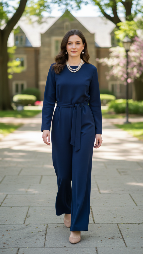 Unique jumpsuit accessories like structured blazers or lightweight scarves provide additional styling options. Choose pointed-toe flats or low heels for comfortable walking across campus while photographing your graduate’s milestone achievement.