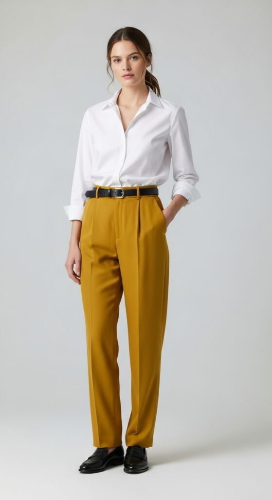 This is your foolproof, can’t-mess-it-up starter look. Crisp white button-up tucked into mustard trousers? Chef’s kiss. It’s clean, it’s polished, and it works for literally any occasion where you need to look like you have your life together (even if you’re lowkey winging it).
