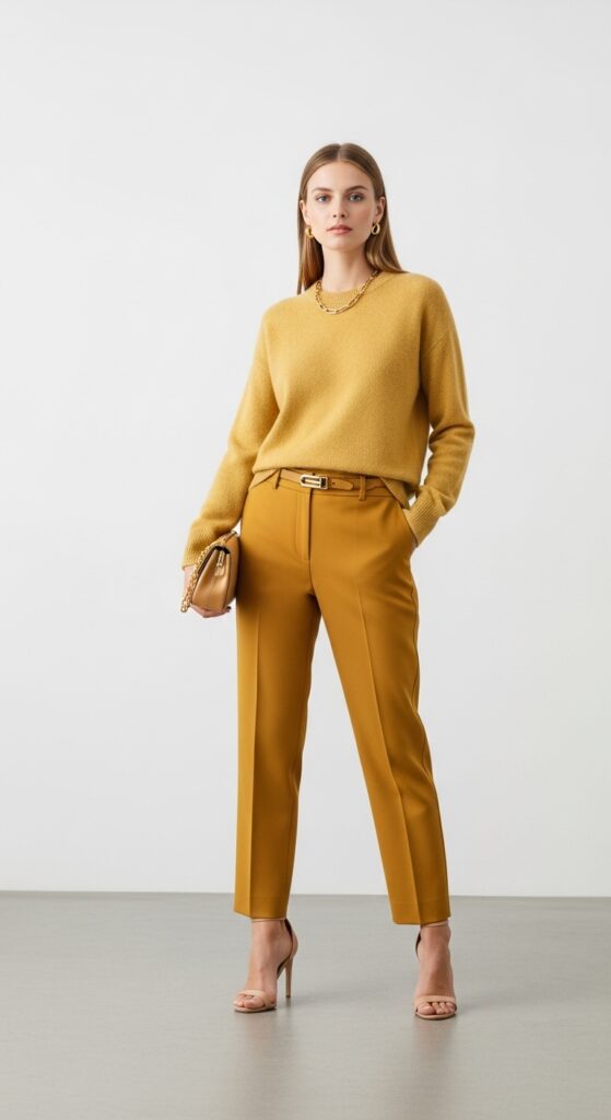 Pair your mustard trousers with a lighter mustard sweater or a golden-toned silk blouse. Mix textures—think chunky knits with sleek trousers or silky tops with structured pants. Add neutral accessories in tan, cream, or cognac to break things up just enough. Nude heels or tan ankle boots keep the tonal vibe going strong.