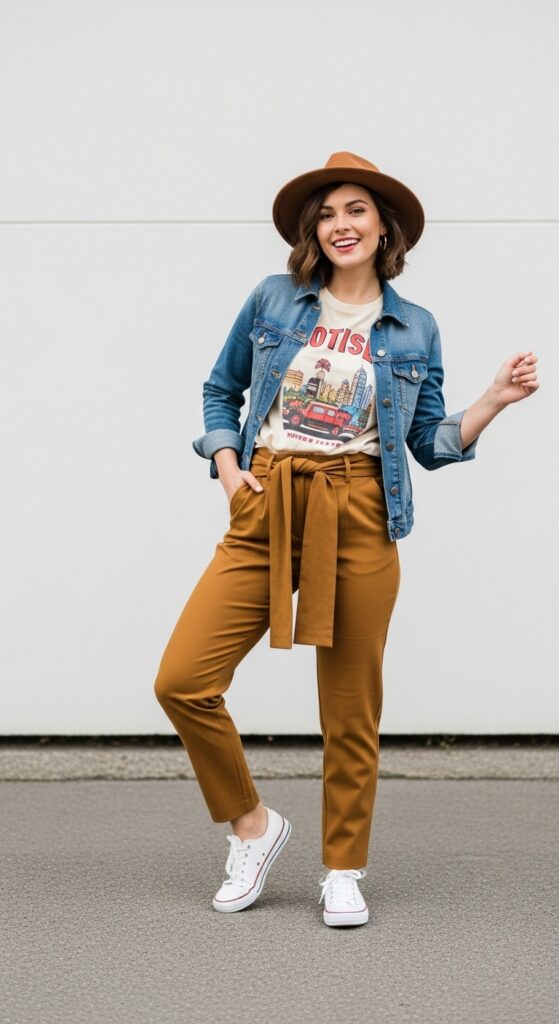 Keep your shoes casual (sneakers are your friend here) and add a denim or utility jacket if you need an extra layer. The key is letting your tee be the focal point while the mustard trousers provide that pop of color. This outfit screams “I have style but I’m also fun,” which is honestly the best kind of energy.