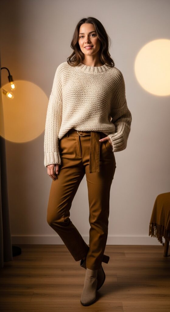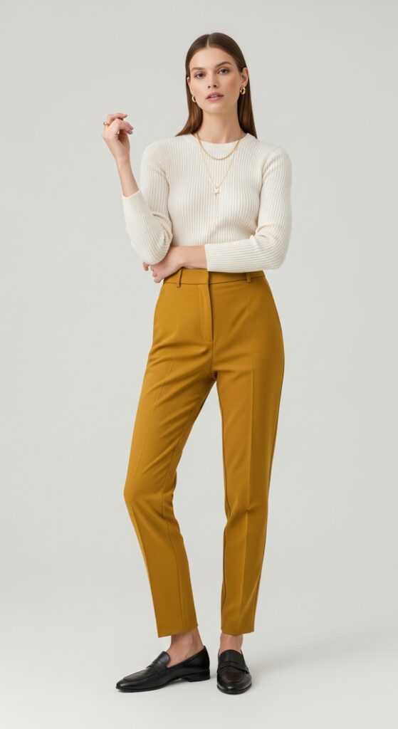 Sometimes you want to let the trousers shine without a ton of competing elements. Enter: a neutral-toned knit sweater in cream, beige, or soft grey. The muted top lets the mustard be the star while keeping everything feeling cohesive and elegant.