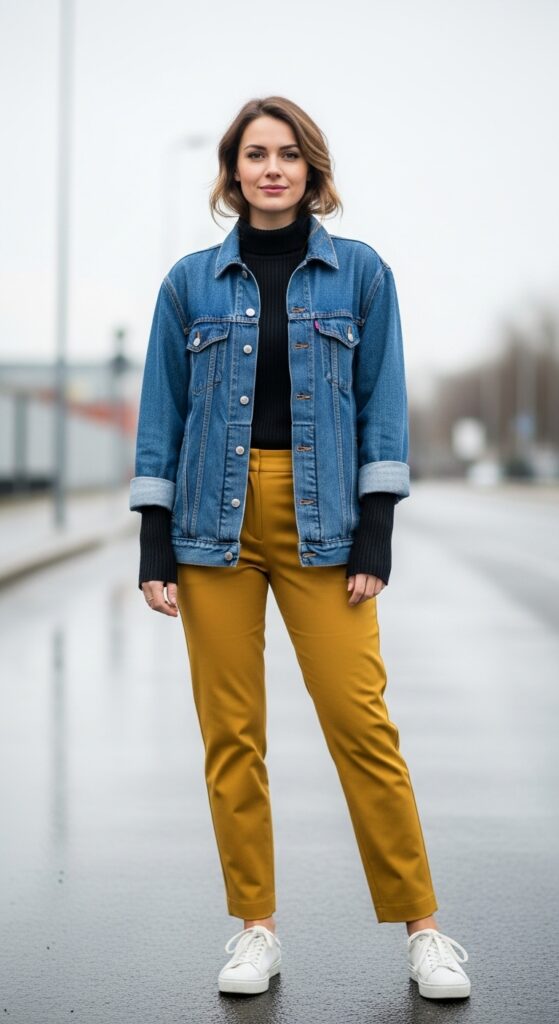 Okay hear me out: denim on mustard is a whole vibe. There’s something about that casual, lived-in denim jacket paired with these trousers that just feels right. It’s like the perfect balance of polished and “I’m not trying too hard.”