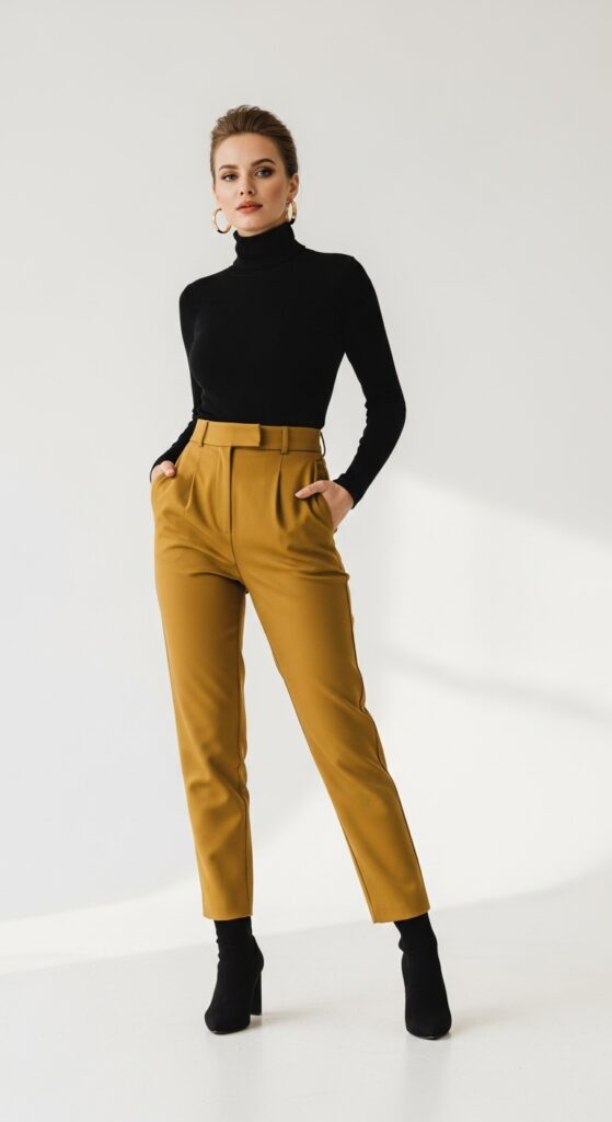 If you want to look expensive without actually spending expensive money, this is your move. A sleek black turtleneck tucked into mustard trousers is fashion editor approved, trust me. The combo is classic, timeless, and works for everything from dinner dates to gallery openings (if that’s your thing).
