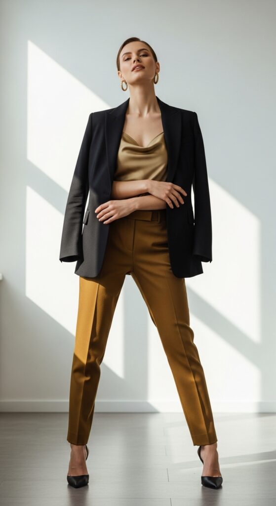 Go for a neutral blazer in black, navy, or camel. Underneath, keep it simple with a silk cami or a fitted tank. The mustard trousers add just enough personality to keep this from feeling too corporate. Finish with pointed-toe heels and minimal jewelry, and you’re ready to conquer meetings, presentations, or literally anything that requires you to look like a boss.