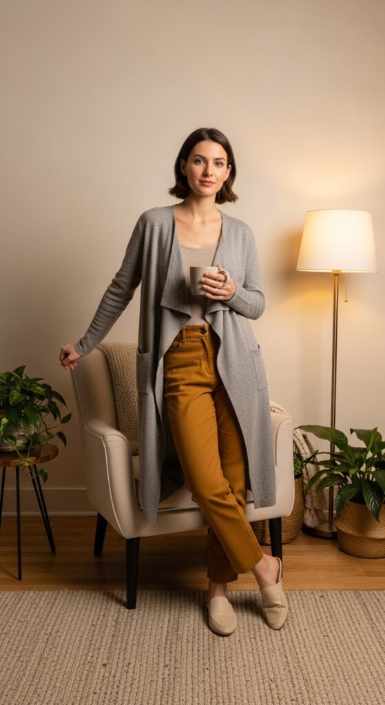 Layer over a simple tank or fitted tee, and let the cardigan do all the work. Add a belt over the cardigan if you want to cinch your waist, or leave it open for maximum coziness. Slip-on mules or low-heeled boots keep things easy and wearable.