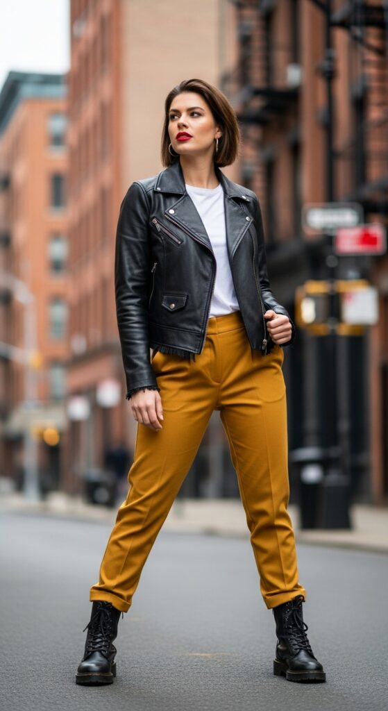 Mustard trousers might seem sweet, but pair them with a black leather jacket and suddenly you’re giving off serious cool-girl energy. The contrast between edgy leather and warm mustard is unexpected in the best way possible.