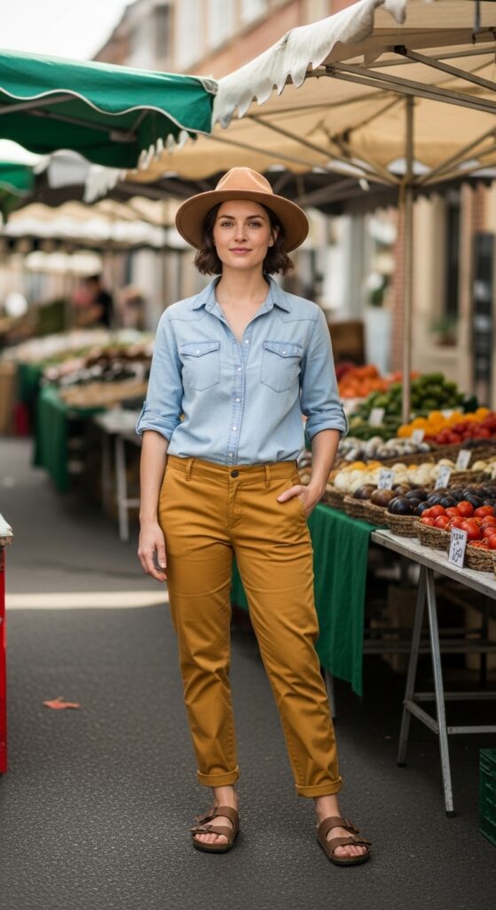 Tuck it in, roll up the sleeves, and you’re basically done. Add a woven belt or leave it simple—both work. Brown leather sandals or white sneakers finish the look without overcomplicating things. Throw on some sunglasses and you’re ready for farmer’s markets, weekend strolls, or basically any casual situation that requires you to look cute without actually trying.