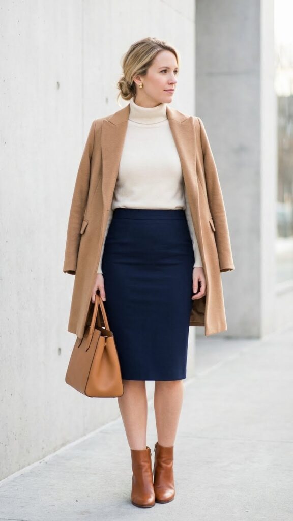 When temperatures drop, a navy pencil skirt paired with a cream turtleneck and camel coat creates a sophisticated winter ensemble that’s both warm and polished.