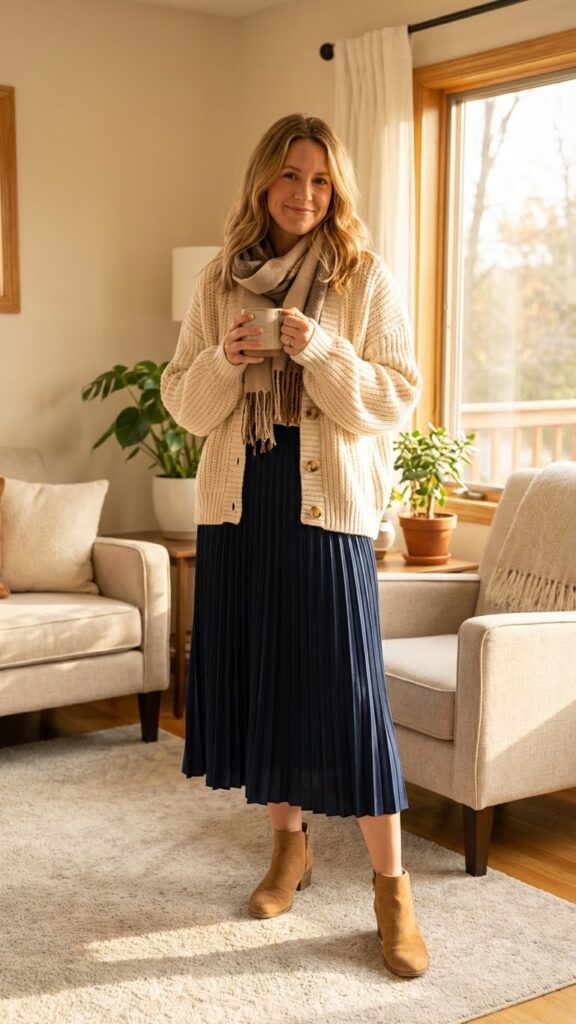 Suede booties add texture and warmth to complete this effortless ensemble. Opt for ankle-height styles in tan or cognac shades for visual contrast. You can also experiment with a navy skirt with cropped sweater underneath your cardigan for added layering.