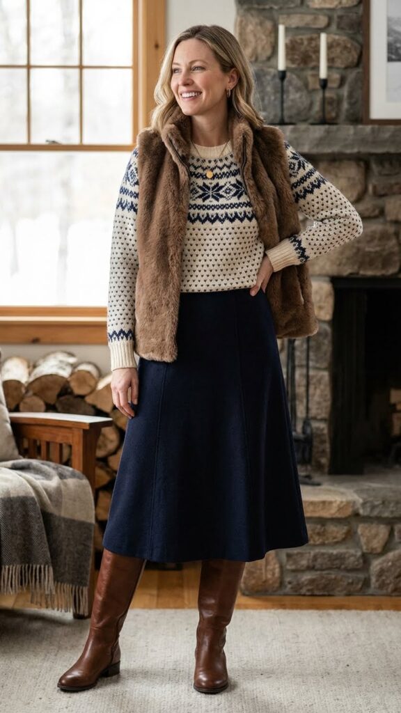 When you’re looking to adopt classic winter style, pairing a navy skirt with a Fair Isle sweater and faux fur vest delivers a cozy, eye-catching combination. The textures and patterns work together to create visual interest while keeping you warm during chilly days.