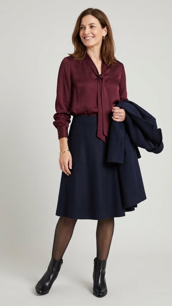 The rich burgundy color of your blouse creates a stunning contrast against the navy fabric. This jewel-tone combination feels luxurious and perfectly suited for winter’s deeper palette. Choose a blouse with subtle details like gathered sleeves or a tie neck for added interest.