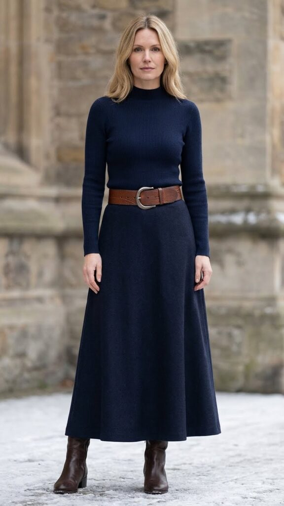 Three simple layers alter your navy skirt into a cozy winter statement that’s both practical and stylish. Opaque tights create a seamless foundation that keeps you warm while extending your favorite skirts into colder months. Choose black or deep burgundy tights to complement the navy fabric beautifully.