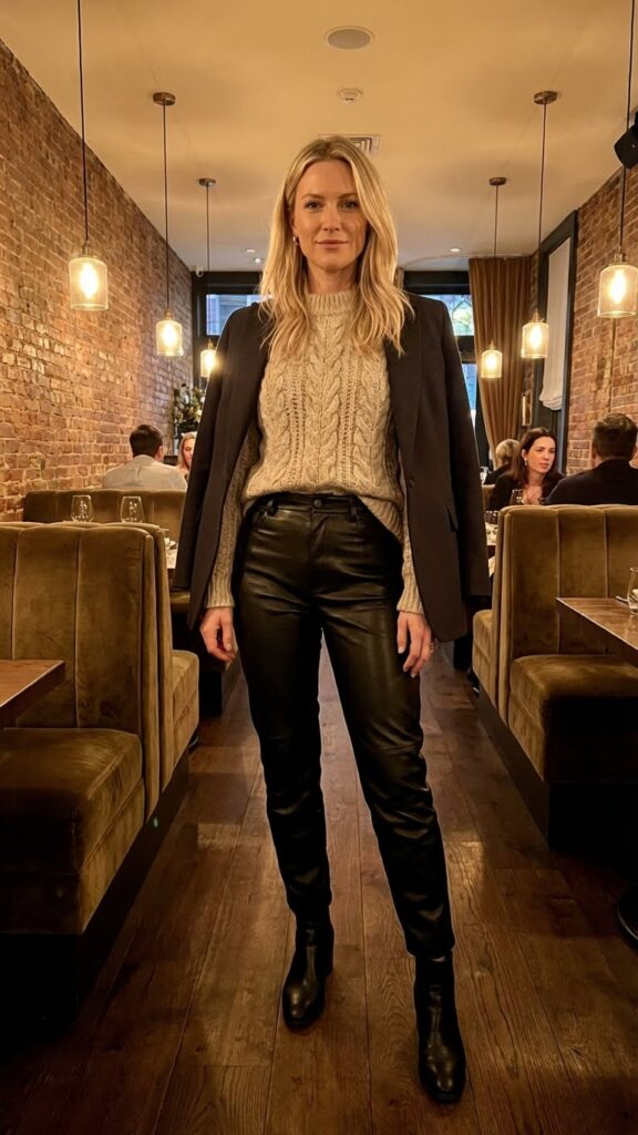 Okay, hear me out. Leather pants aren’t just for rock concerts and Halloween costumes. Pair them with a chunky knit sweater, and you’ve got this gorgeous balance of edge and comfort. The sweater softens the leather’s toughness, creating a night out dinner outfit that’s modern and incredibly flattering.