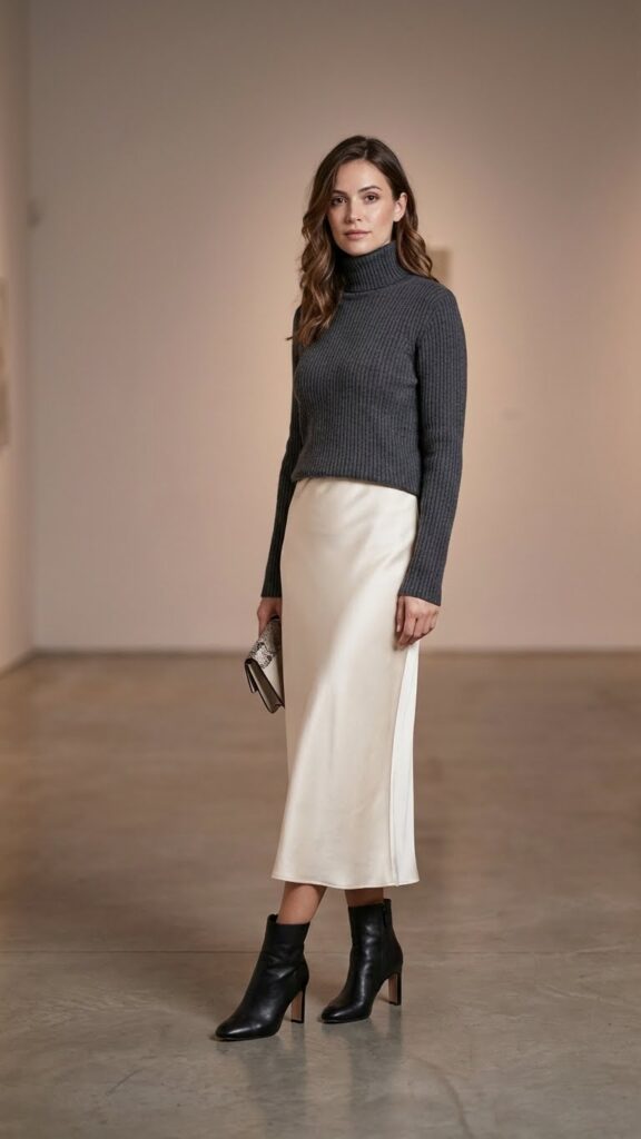 Midi skirts are incredibly underrated for dinner outfits. They’re comfortable, flattering on pretty much everyone, and inherently elegant. A satin midi skirt paired with a fitted turtleneck gives you this sophisticated silhouette that works year round.