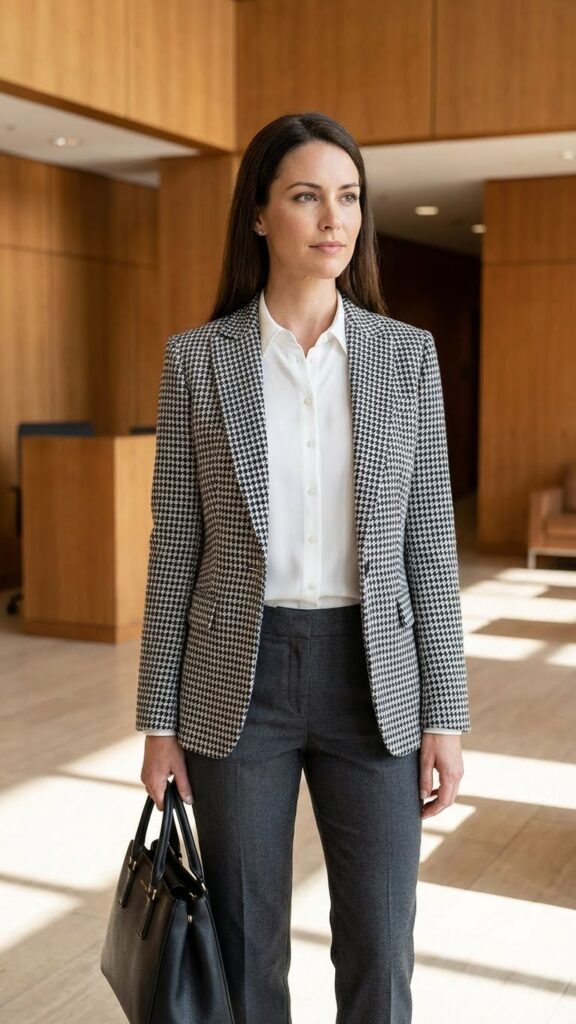 Houndstooth patterns bring instant sophistication to your professional wardrobe when you coordinate them thoughtfully with solid-colored pieces. You’ll achieve timeless elegance by pairing a houndstooth blazer with crisp white blouses and charcoal trousers. This classic combination creates visual interest while maintaining professional boundaries.