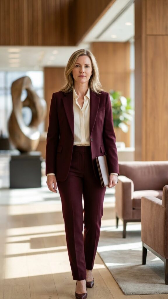 A velvety burgundy blazer pairs beautifully with cream silk blouses and pearl accessories, creating timeless elegance. Rich burgundy trousers work equally well with neutral tops, allowing you to mix and match effortlessly. These separates give you flexibility to create multiple looks while maintaining that coveted old money aesthetic that sets you apart from typical office attire.