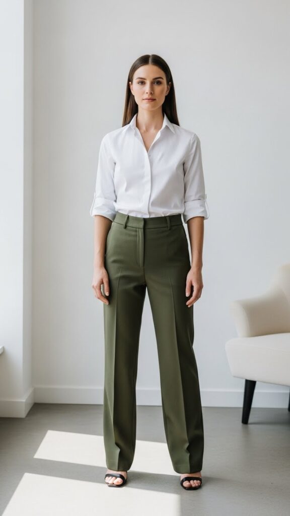 Nothing says “I have my life together” quite like a white button-down tucked into olive green trousers. This combo is basically the uniform of people who drink green juice and actually enjoy it. The contrast between the bright white and the muted green creates this clean, put-together vibe that works for literally everything.