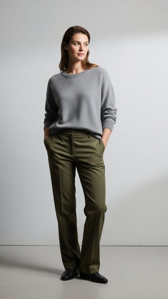 A soft gray sweater against olive creates this muted, sophisticated palette. Opt for cashmere or at least something that looks like it for that elevated feel. Keep accessories minimal and let the textures do the talking. Silver jewelry works beautifully here. This is the outfit for when you want to look expensive without saying a word.