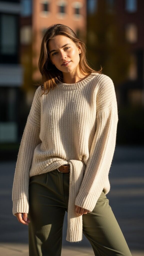 The creamy neutral against the earthy olive creates this warm, autumnal palette that photographs insanely well. Tuck the front of your sweater in loosely to define your waist without sacrificing comfort. Add some suede ankle boots and a structured tote bag, and you’re basically a walking Pinterest board. This outfit is all about looking polished while feeling like you’re wrapped in a blanket.