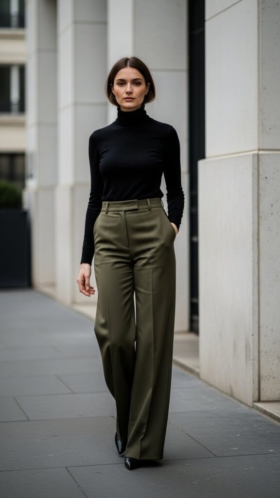 Want to look chic without thinking too hard? Black turtleneck plus olive green trousers equals instant sophistication. This pairing gives major French girl energy, and who doesn’t want to channel that effortless Parisian vibe?