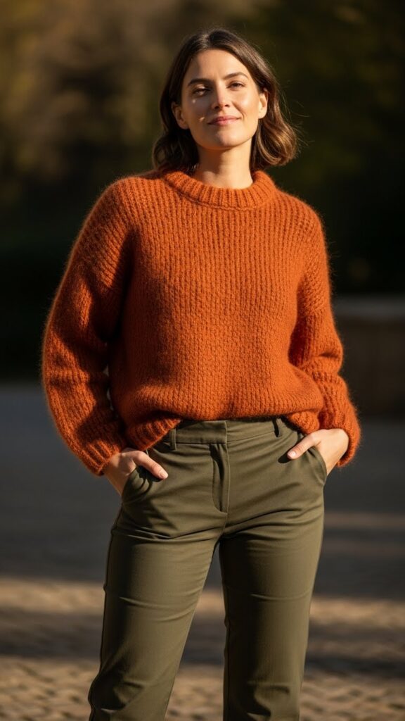 This combo works because both shades exist in the same warm-toned family. A chunky rust sweater with olive trousers hits that perfect balance between cozy and stylish. Add some brown leather accessories to tie everything together, maybe some tortoiseshell sunglasses if you’re feeling fancy. This outfit screams confidence and proves you’re not afraid to play with color.