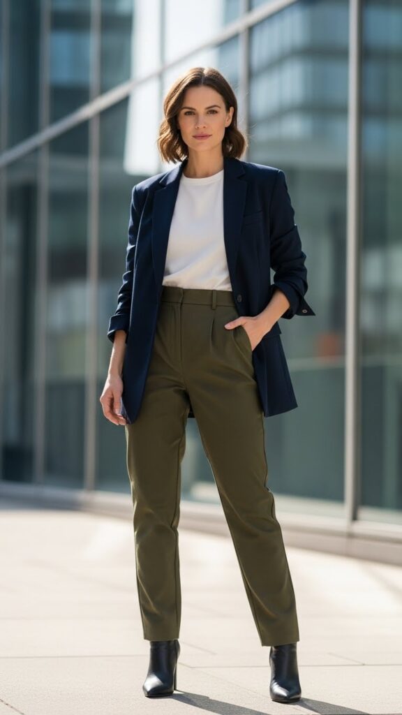 Olive green trousers under a navy blazer? Chef’s kiss. This combination is sophisticated enough for the office but relaxed enough that you don’t look like you’re trying too hard. Navy and olive are both neutrals in their own right, but together they create visual interest without clashing.