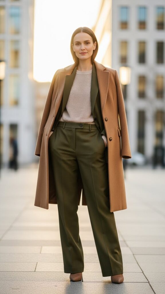 The warm camel against the cool olive creates this rich, luxurious feel. Underneath, keep things simple with a black or cream knit. Structured camel coats work best because they contrast nicely with more relaxed olive trousers. Add some brown leather boots and a matching bag, and you’ve basically achieved rich aunt status.