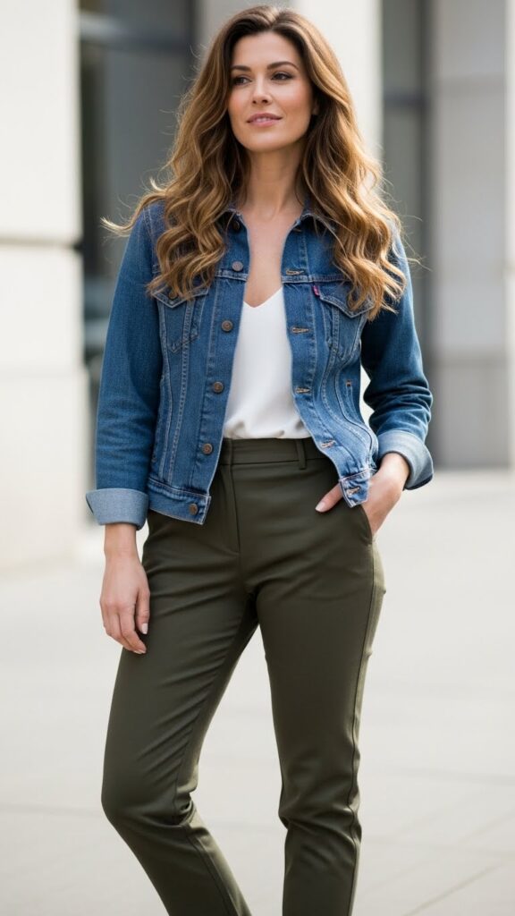 Sometimes you want to look cute without looking like you tried too hard. Enter the olive green trousers and denim jacket combo. This pairing is casual, comfortable, and perfect for errand-running days when you still want to feel put together.