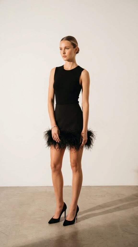 Style tip: keep the rest of your outfit simple. Let the feathers do the talking. Pair a feather hem mini skirt with a fitted black top and classic heels. Or rock a feather trimmed blouse with sleek trousers. The texture contrast is everything, and photos will absolutely love you for this choice.