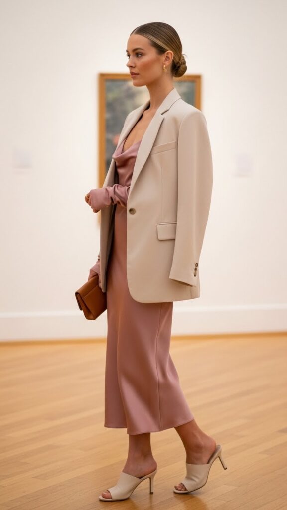 The slip dress blazer combo has been having a moment for years now, and honestly? It deserves the hype. A dusty rose silk slip dress layered under a structured blazer gives you that perfect balance between soft and powerful.