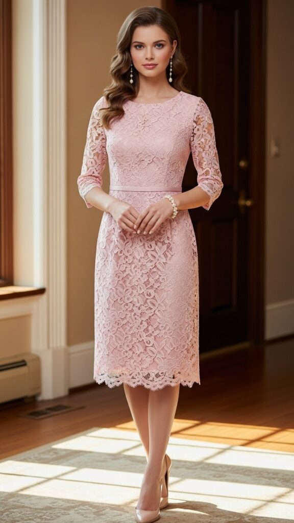 Pearl jewelry is the natural partner here. Think pearl drop earrings, a delicate pearl bracelet, or even a pearl hair clip if you’re feeling extra. The combination of lace and pearls creates this timeless, elegant aesthetic that never goes out of style. Keep your shoes simple in nude or blush to let the dress and pearls take center stage. This is one of those pink dress party outfit ideas that photographs beautifully and feels special to wear.