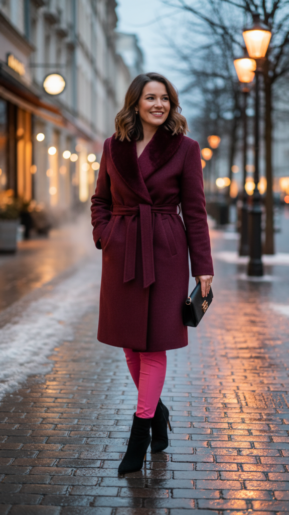 Alter your pink leggings into sophisticated evening wear by pairing them with a structured wrap coat that cinches your waist beautifully. The refined wrap silhouette creates an hourglass shape while maintaining comfort for dinner dates or theater outings.
