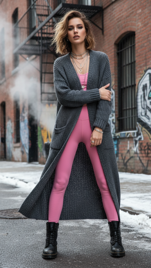 Alter your pink leggings into a bold statement piece by layering them with a long cardigan and sturdy combat boots for an unexpectedly chic winter look.