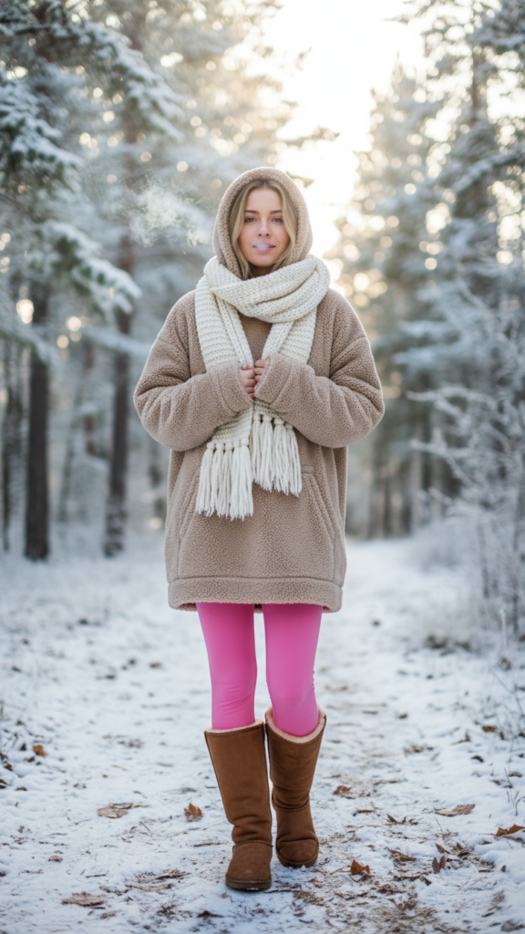 Choose an oversized fleece-lined hoodie in neutral tones like cream, gray, or soft beige to complement your pink leggings beautifully. The plush interior provides exceptional insulation against cold temperatures while maintaining breathability.