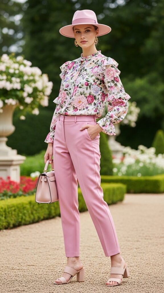 When you want pink trousers to feel romantic and feminine, a floral blouse is your new best friend. Choose a print that includes pink tones for a cohesive look, or go with contrasting florals for something bolder.
